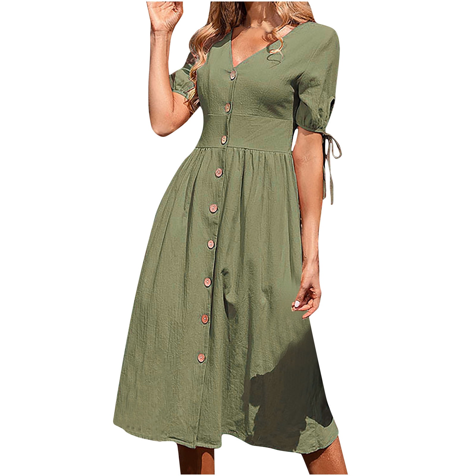 Sun Dresses For Women V Neck Button Down Cotton Linen Dress Solid Color Casual Soft Summer A Line Swing Midi Dress Walmart Com